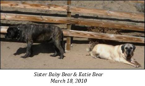 Our Katie Girl, we miss you baby. Since you left us so suddenly, we’ve sat around with the pack & celebrated your life, remembering how you came to us, so shy, so gentle. You knew it was home before we did, remember when we tried to re-home you with that lovely couple? You stayed in their bedroom, refusing to come out until they called us letting us know that perhaps you were not the “right one” for them, but you certainly were the “right one” for us. You’ve been with us ever since. From the get go, you were plagued with so many problems that we addressed one by one, you were always a stubborn Patient but you knew we were trying to help you. What a girl, and we loved you every second of every day. We had high hopes that with Dr. Pelsue’s help, your elbow was finally tolerable but you suddenly became so very ill and this time we were at a loss and in the end, you decided to go to the other side joining your sister “Sassy Girl” who left us in December, 2009. You were our first Mastiff in “Greta’s Garden”, now all the others have joined you —— overlooking Sugarland, keeping guard in your deep sleep. We love you & miss you —- we feel your presence when we visit you each day. Be at peace our beautiful, fawn, gorgeous Katie Bear Girl.